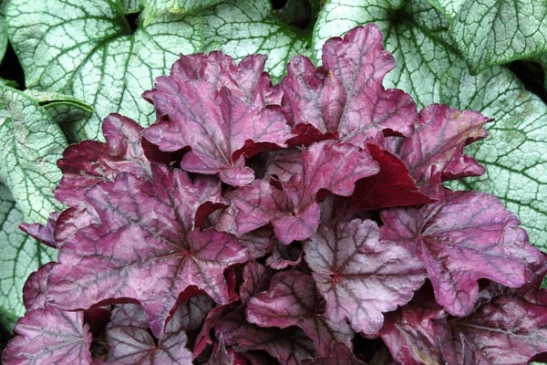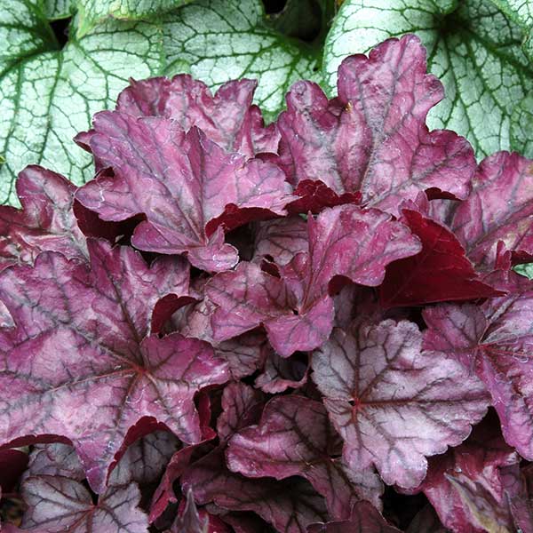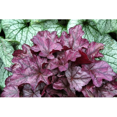 Shiny purple leaves all summer long. Attractive white flowers appear in spring and summer.Winter colour alters to become toned with a silver sheen .Height 25cm x 25cm