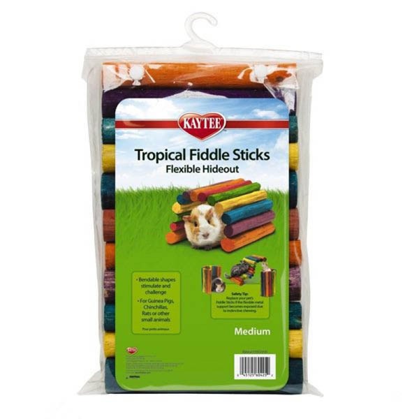 Tropical fiddle sticks are flexible wooden sticks that can be twisted andbent into a variety of fun shapes creating a fun hiding spot for your furryfriend. You'll have fun creating a log cave, tree stump or a stick stairwayfor your pet. These colorful logs also provide your pet with a safe sourcefor their instinctive chewing behaviors. Large tropical fiddle sticks areperfectly sized for rabbits, guinea pigs, and chinchillas.